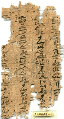 Der Papyrus Harageh 1 wurde in einem Grab auf einem Friedhof in der Oase Fajjum gefunden. Er datiert aus dem späten Mittleren Reich und wird derzeit im Petrie Museum, London unter der Katalognummer UC 32773 aufbewahrt.