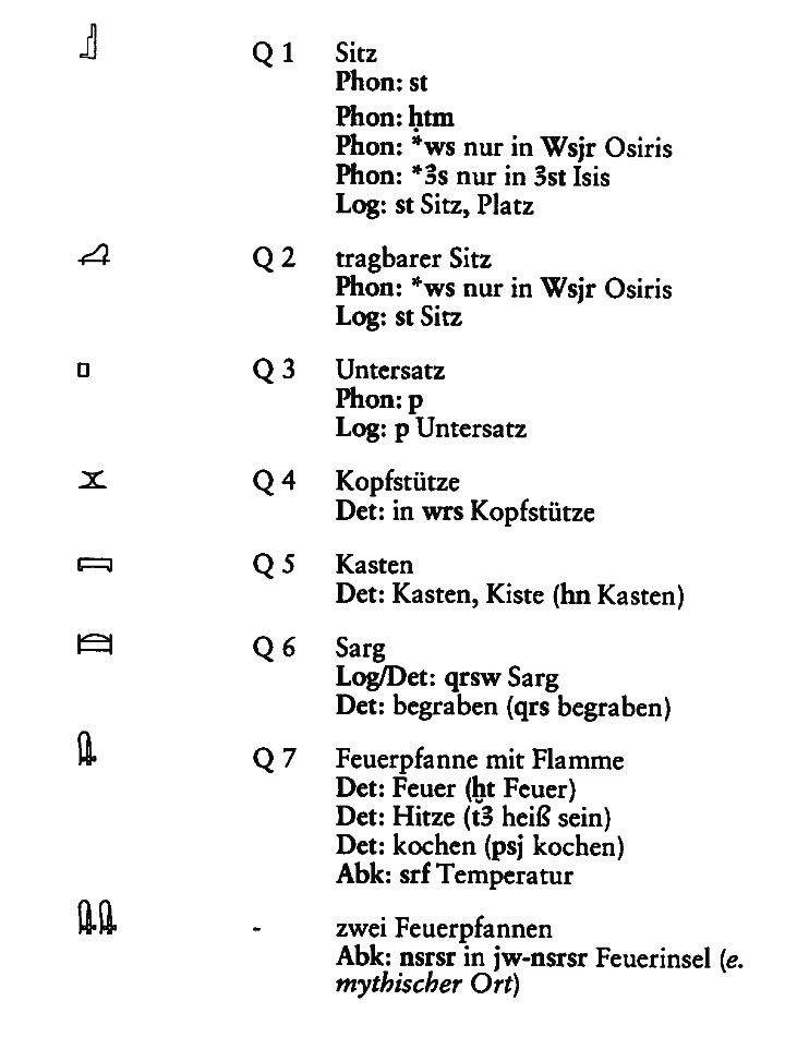 Phon: st, Htm, As (nur in Ast "Isis"), ws (nur in wsjr "Osiris") Log: Sitz (st), Platz, Isis (Ast) |