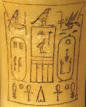 Königstitulatur Pepi II. links: Goldhorus-Name: Pepi Mitte: Horus-Name: Irnetjeru (evtl. auch Netjeriru?) rechts: Nisut-Bit-Name: Neferkare letzte Zeile: "dem Leben gegeben sei wie Re"