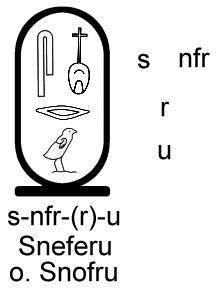 Übersetzung (von rechts nach links): "(Horusname) Nebmaat, König von Ober- und Unterägypten, (Nebti-Name, Goldhorus-Name) Nebmaat, Sneferu"